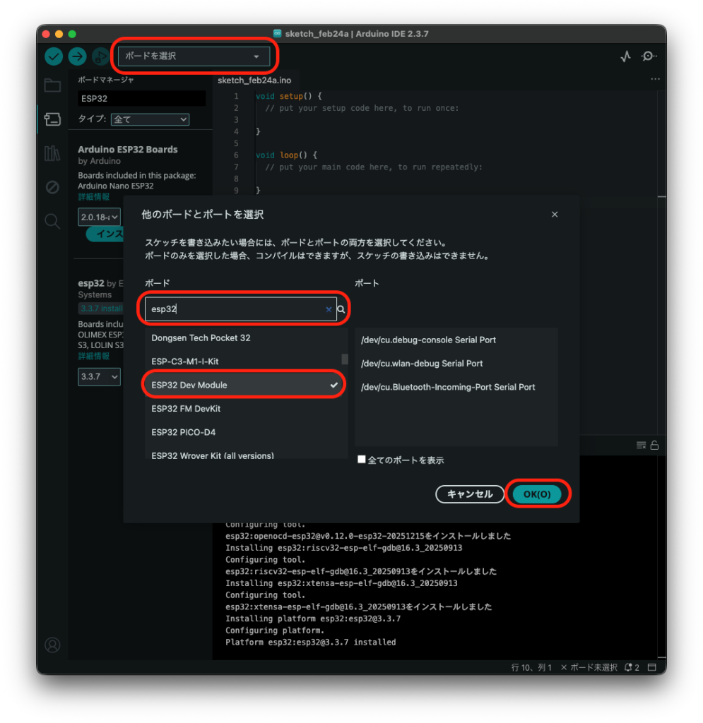 初期状態ではESP32系のボードが選択できない(グレーアウトしている)ので、パッケージを追加する必要がある。