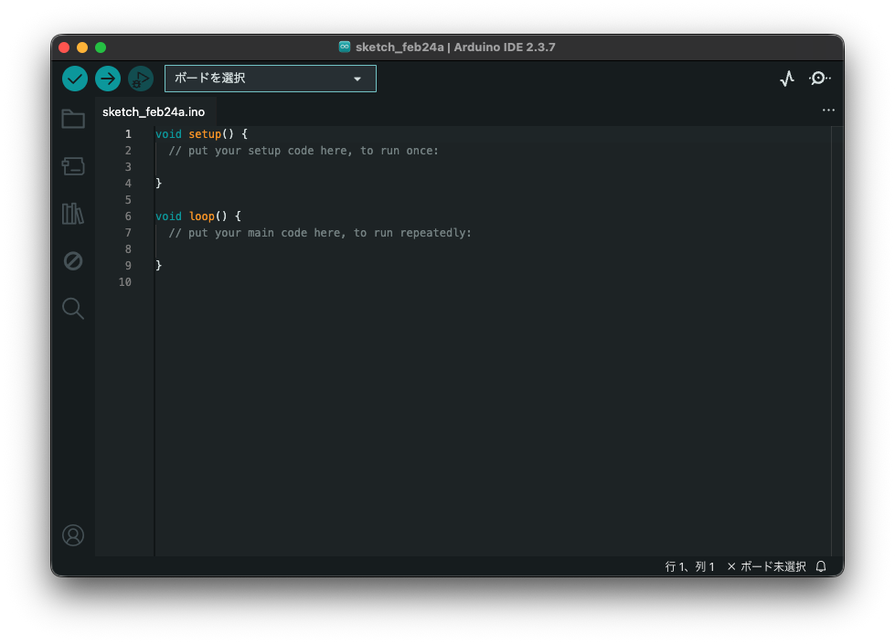 インストールして起動してみると、いきなり sketch_feb24a.ino といった雛形が表示された。