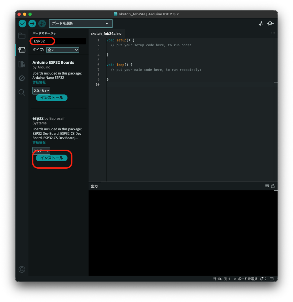 - 出てきた 「esp32 by Espressif」 をインストール。