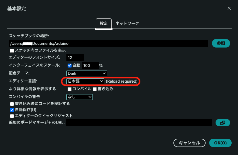 英語のままでもいいが、少しでも脳の負荷を減らすために日本語化しておく。 メニューバーの [Arduino IDE] > [基本設定] から言語を「日本語」に変更。パッと見た時に日本語で情報がスッと入ってくるのだいじ。