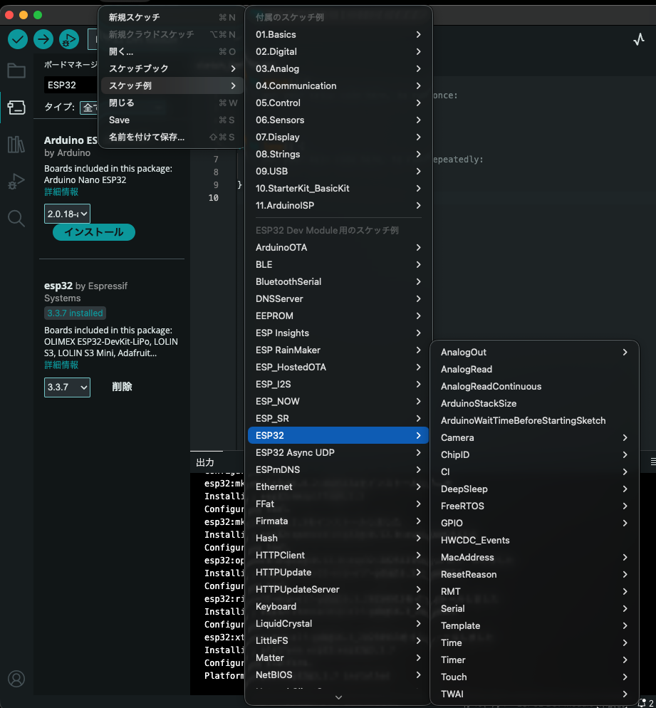 メニューバーの [ファイル] > [スケッチ例] を覗くと、最初から動かせるサンプルコードが山ほど入っていた。 Wi-FiやBluetoothなど、ジャンル分けされているので、これをベースに改造していくのが賢いのやり方だろう。
