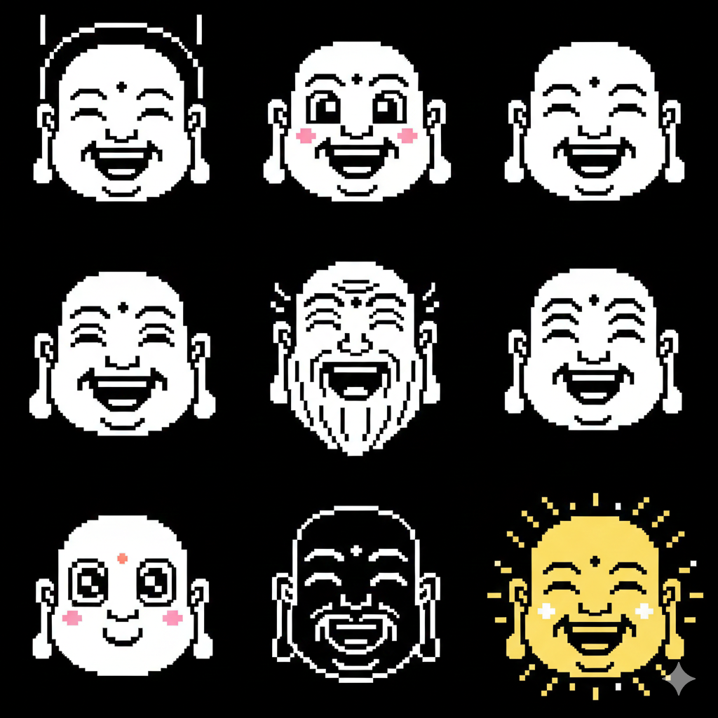 128×64の低解像度で機嫌を表現したい。まずは「笑顔の仏」をドット絵で作ってくれ。縦横両方のパターンが見たい。