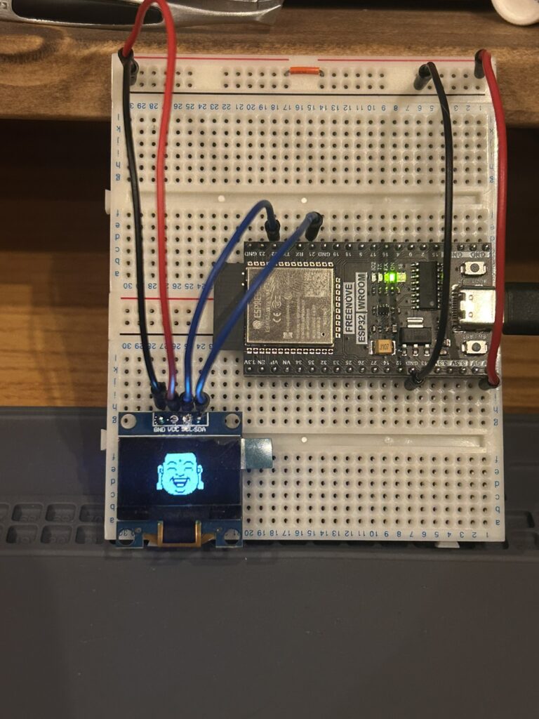生成された配列をスケッチに貼り付け、ESP32へ書き込む。 張り詰めた空気の中、0.96インチの小さな画面に光が灯った。