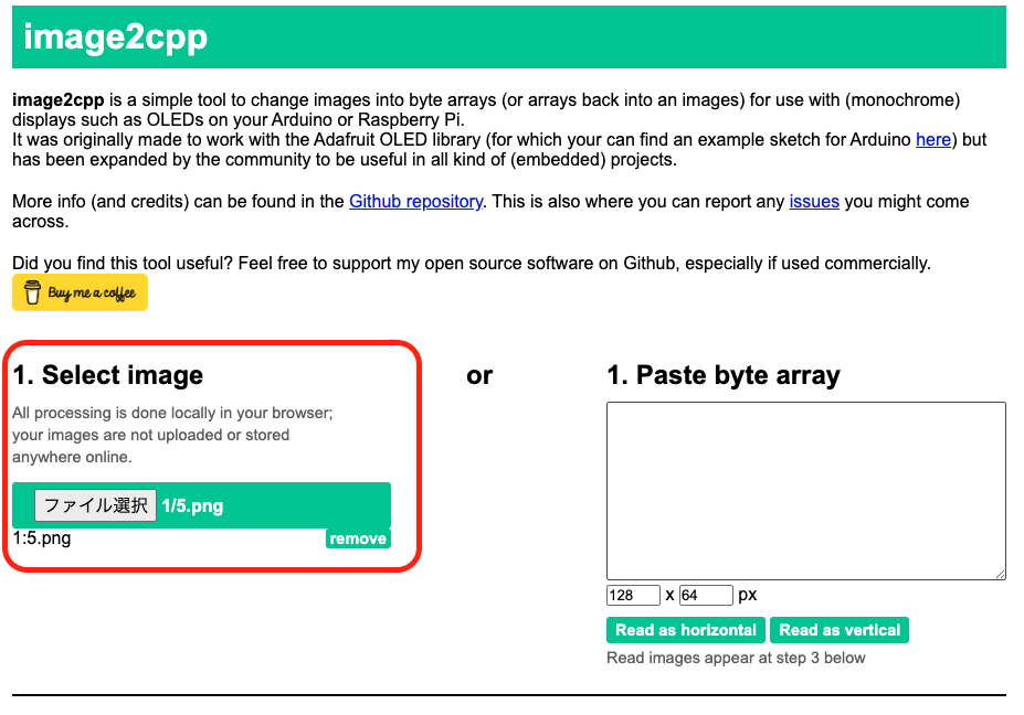 ネットの海を捜索した結果、ズバリ目的通りの神サイトを発見した。 それが、image2cpp だ。
