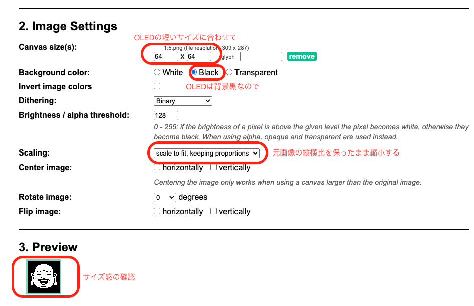このサイトを使えば、画像のリサイズから、OLED(SSD1306など)で読み込めるPROGMEM形式への変換まで一気通貫で行える。