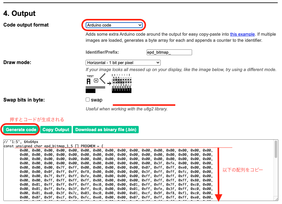 3. Output: 「Code output format」を Arduino Code にして生成。